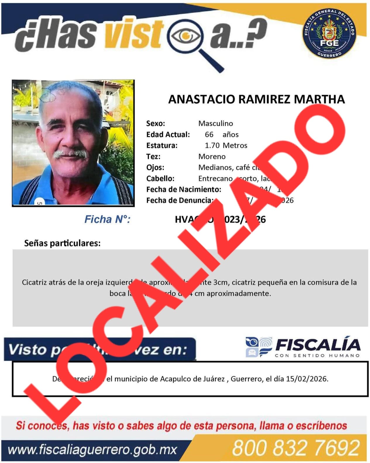 Fiscalía General del Estado agradece su colaboración, Anastacio Ramírez Martha fue localizado sin vida.