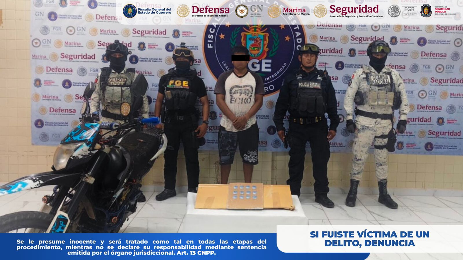Chilpancingo, Gro., a 20 de marzo de 2026.– La Fiscalía General del Estado de Guerrero informa que, en coordinación con la Secretaría de la Defensa Nacional (DEFENSA), Guardia Nacional (GN), Secretaría de Seguridad y Protección Ciudadana (SSPC) y Policía Estatal (SSPGro), realizó la detención en flagrancia de Rodrigo “N”, en Zumpango del Río, municipio de Eduardo Neri, Guerrero.