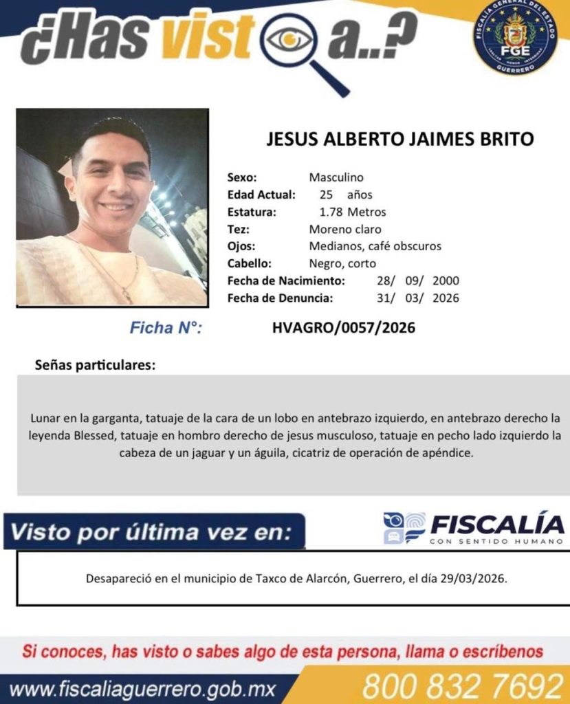 Chilpancingo, Gro., a 2 de abril de 2026.– La Fiscalía General del Estado de Guerrero mantiene e intensifica las acciones de búsqueda y localización de Jesús Jaimes “N”, quien fue reportado como desaparecido en el municipio de Taxco de Alarcón.