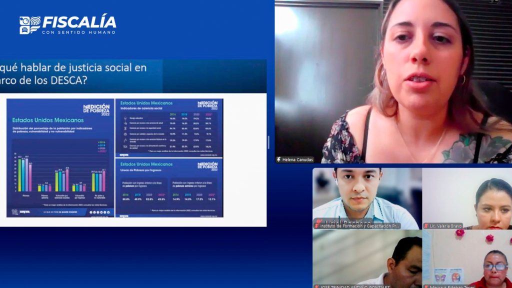 Esta conferencia impartida en modalidad a distancia a través de la plataforma digital Zoom, estuvo a cargo de la Mtra. Helena Marina Canudas Madrigal, ponente de la Comisión Nacional de los Derechos Humanos (CNDH), con el propósito de fortalecer el conocimiento, la reflexión crítica y el compromiso social en torno a los derechos económicos, sociales, culturales y ambientales, destacando su importancia para garantizar la dignidad humana, la justicia social y el desarrollo sostenible, así como fomentar acciones concretas para su protección y cumplimiento en la sociedad.