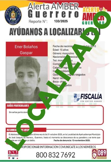 Fiscalía General del Estado agradece su colaboración, Ener Bolaños Gaspar ya fue localizado.