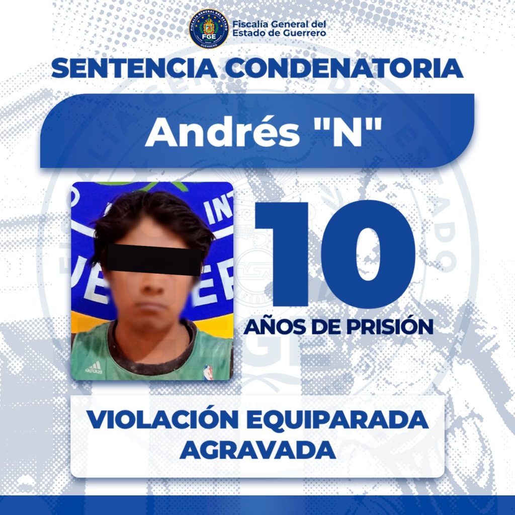 Chilpancingo, Gro., a 17 de abril de 2026.- La Fiscalía General del Estado de Guerrero logró que un juez dictara sentencia condenatoria de 10 años de prisión en contra de Andrés “N”, por el delito de violación equiparada agravada, cometido en perjuicio de una víctima menor de edad de identidad reservada, en Iguala de la Independencia, Guerrero.