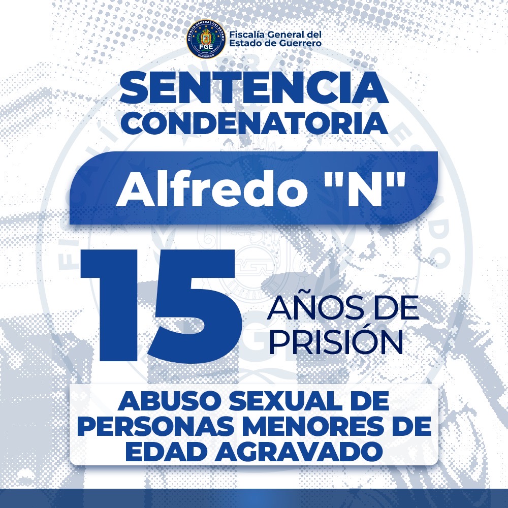 Chilpancingo, Gro., a 17 de abril de 2026.- La Fiscalía General del Estado de Guerrero, logró que un juez dictara sentencia condenatoria de 15 años de prisión en contra de Alfredo “N”, por el delito de abuso sexual de personas menores de edad agravado, cometido en agravio de una víctima de identidad reservada, en el municipio de Ayutla de los Libres.