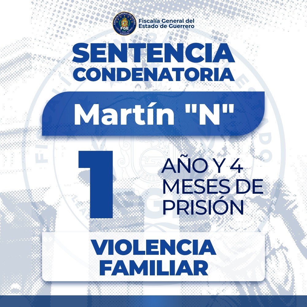 Chilpancingo, Gro., a 17 de abril de 2026.- La Fiscalía General del Estado de Guerrero, logró que un juez dictara sentencia condenatoria de 1 año y 4 meses de prisión en contra de Martín “N”, por el delito de violencia familiar, cometido en perjuicio de dos víctimas de identidad reservada, en el municipio de Acapulco de Juárez.