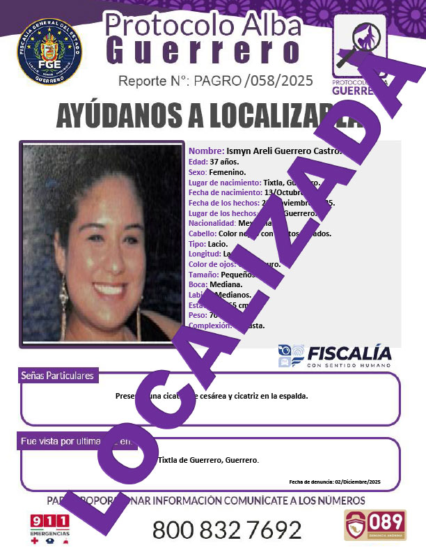 Fiscalía General del Estado agradece su colaboración, Ismyn Areli Guerrero Castro fue localizada.
