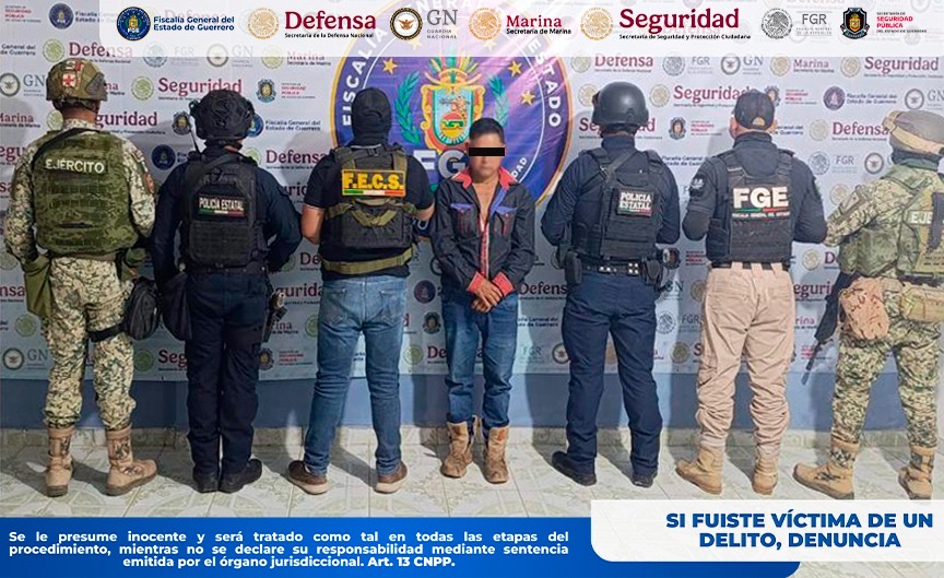 Chilpancingo, Gro., a 20 de abril de 2026.– La Fiscalía General del Estado de Guerrero informa que, en coordinación con la Secretaría de la Defensa Nacional (DEFENSA), Guardia Nacional (GN), Secretaría de Seguridad y Protección Ciudadana (SSPC) y Policía Estatal (SSPGro), cumplimentó una orden de aprehensión en contra de Rutilio “N”, por su probable responsabilidad en el delito de secuestro, en agravio de dos víctimas de identidad reservada, en el municipio de Tlapa de Comonfort, Guerrero.