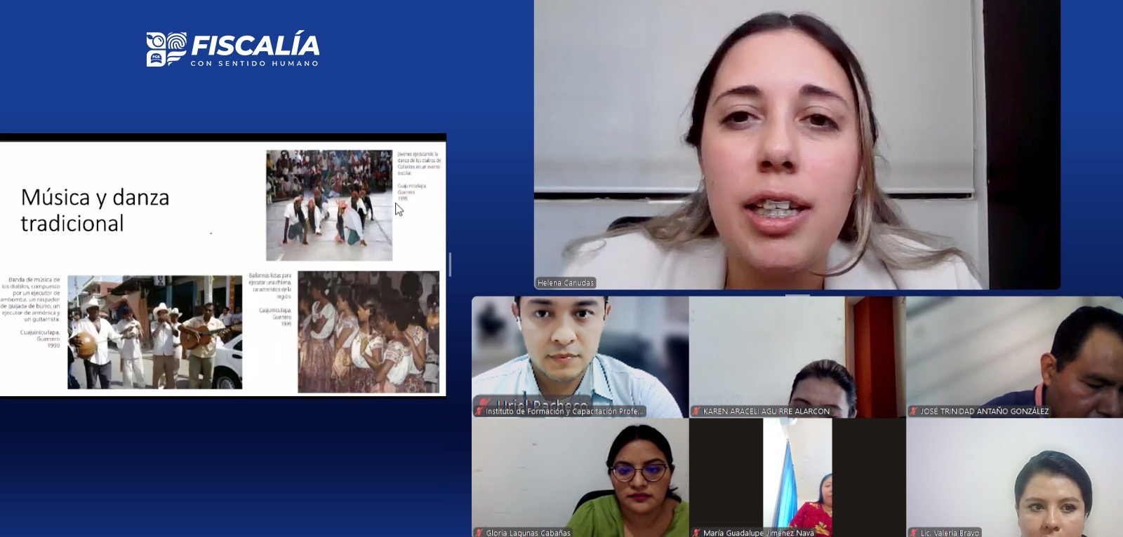 Esta conferencia, impartida en modalidad «a distancia» a través de la plataforma digital Zoom, estuvo a cargo de la Mtra. Helena Canudas Madrigal, ponente de la Comisión Nacional de los Derechos Humanos (CNDH), con el propósito de fortalecer las capacidades del personal de la FGE para identificar, respetar y garantizar los derechos humanos culturales en el ejercicio de sus funciones, incorporando un enfoque intercultural y de no discriminación en la investigación y procuración de justicia. Estos derechos incluyen el acceso a la educación, la participación en la vida cultural de la comunidad, el respeto a las tradiciones, lenguas y costumbres, y la protección del patrimonio cultural.