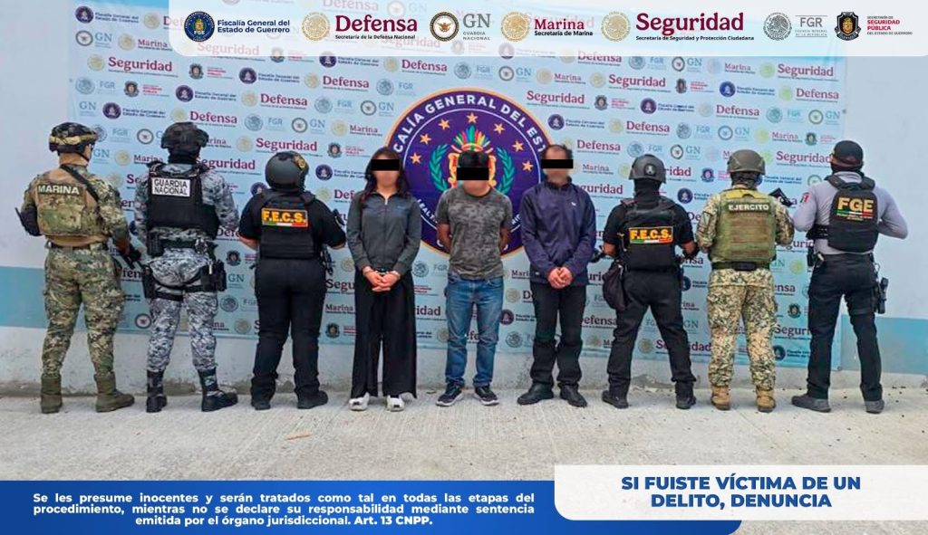 Chilpancingo, Gro., a 27 de abril de 2026.– La Fiscalía General del Estado de Guerrero informa que, en coordinación con la Secretaría de la Defensa Nacional (DEFENSA), Guardia Nacional (GN), Secretaría de Marina (SEMAR), Secretaría de Seguridad y Protección Ciudadana (SSPC) y Policía Estatal (SSPGro), cumplimentó una orden de aprehensión en contra de Jesús Ángel “N”, Salvador “N” y Azul “N”, por su probable responsabilidad en el delito de extorsión agravada, en agravio de una víctima de identidad reservada y del personal de un sitio de taxis, en el municipio de Acapulco de Juárez, Guerrero.